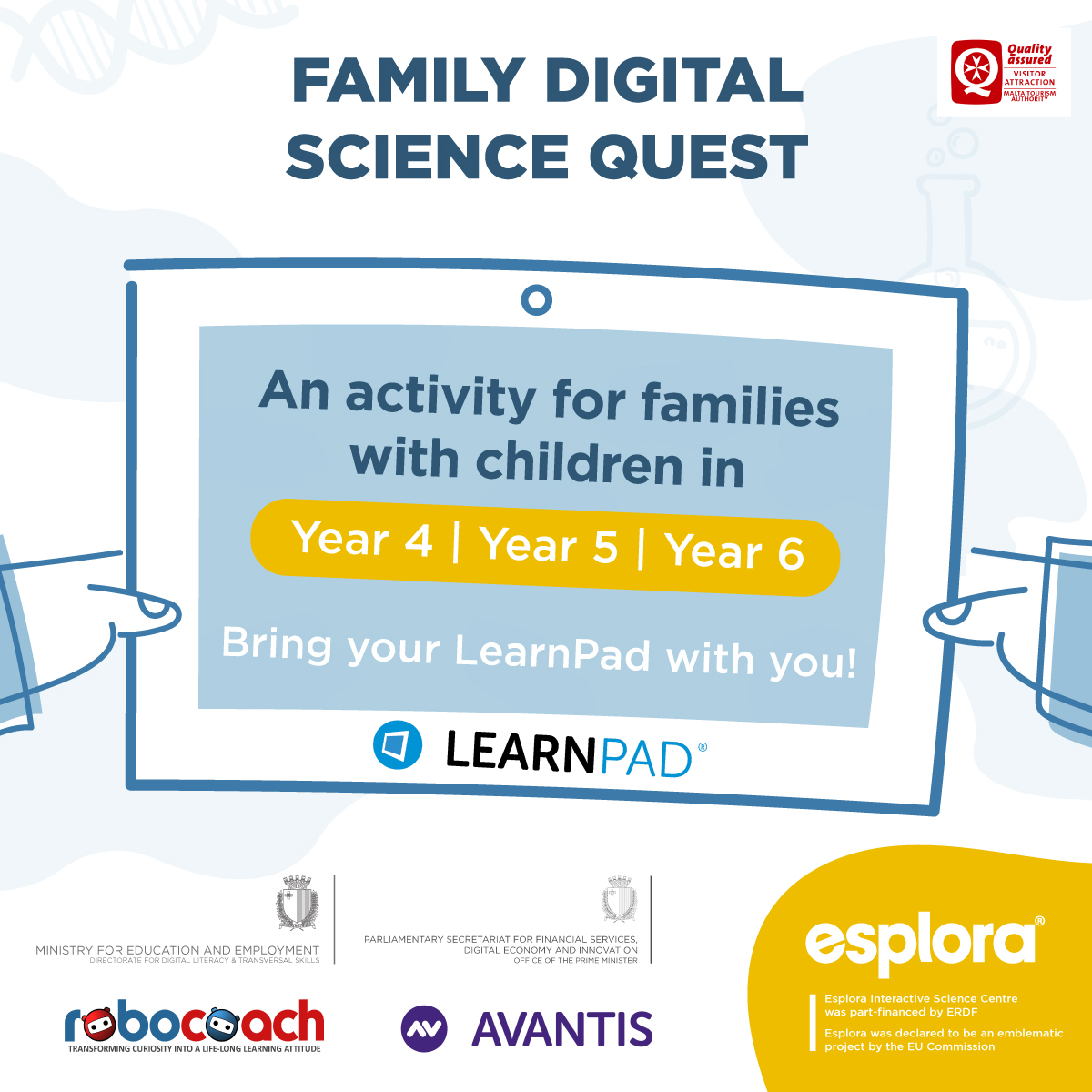 Esplora, in collaboration with the Directorate for Digital Literacy and Transversal Skills within MEDE, robocoach and Avantis, would like to invite children for a series of Family Digital Science Quests!